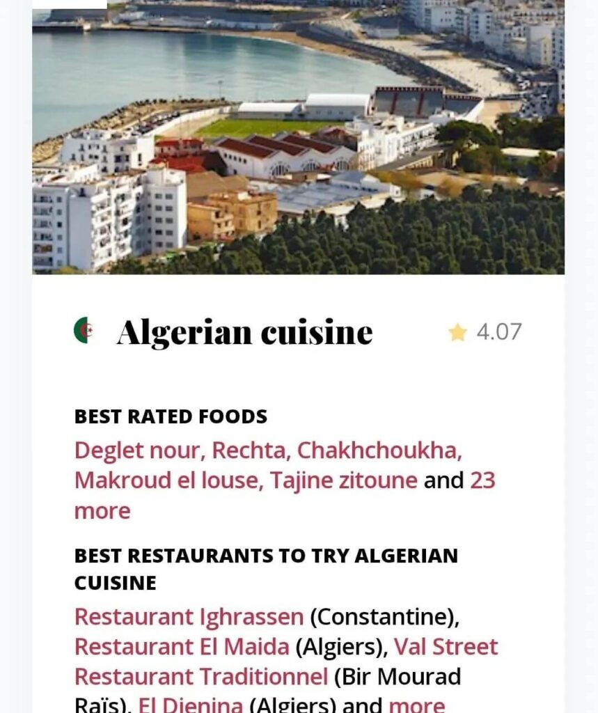 وقد أختير طبق الكسكس كأفضل طبق في الجزائر ويليه الحريرة، المحاجب، الرشتة، شربة فريك، الشخشوخة، البغرير، طاجين الزيتون، المسمن. المخبز، قرنطيطة، لحم حلو، قلب اللوز، مقروط اللوز، الطمينة. المبسس، بوزلوف، كسرة، المعقودة، خبز الدار، شربة بيضاء، شكشوكة والمسفوف.
