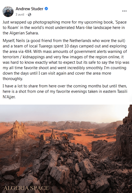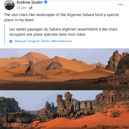عاش المصور الأمريكي، أندرو ستادر، لحظات من الانبهار في عمق الصحراء الجزائرية🇩🇿 بين الجبال الحجرية والرمال الحمراء، مشبها ما رآه بكوكب المريخ